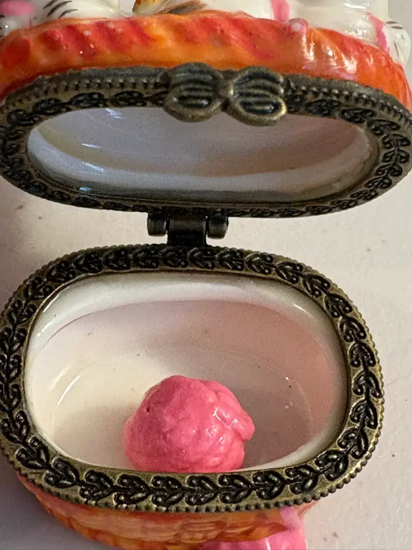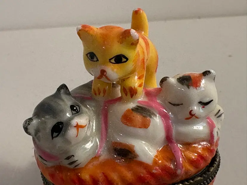 This ceramic trinket box features three cats playing with yarn, adding a charming touch to any collection. The small size and multicolor design make it perfect for all occasions, while the hinged box provides a secure way to store small trinkets. Made from ceramic and porcelain with a glossy finish, this vintage-inspired trinket box originates from China, making it a unique and delightful addition to any cat lover's display.