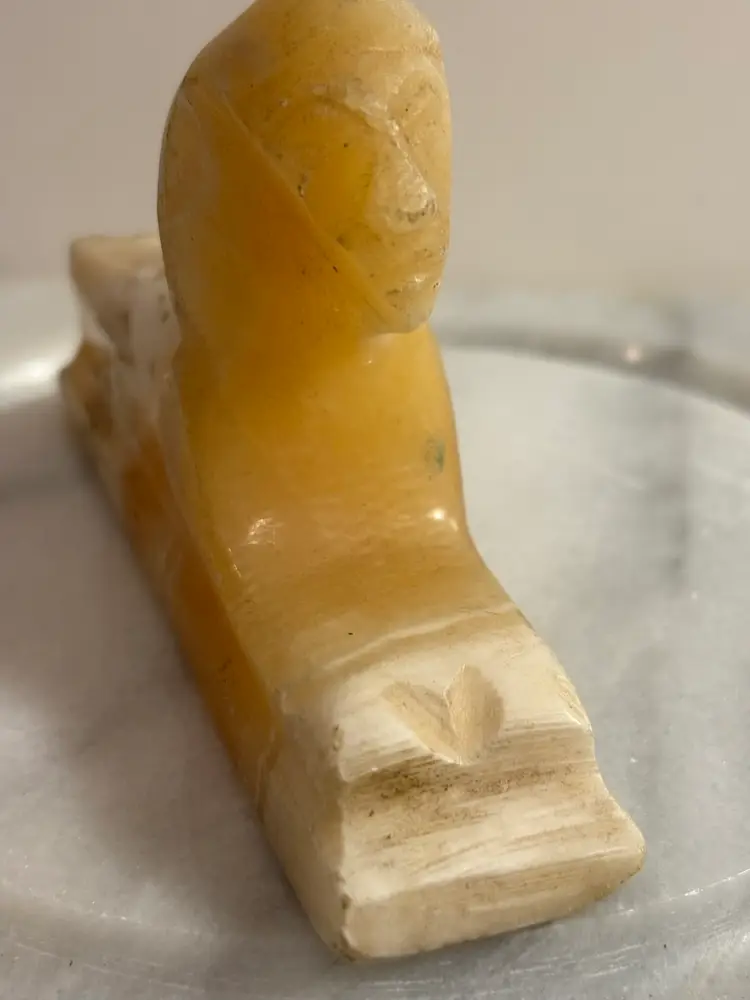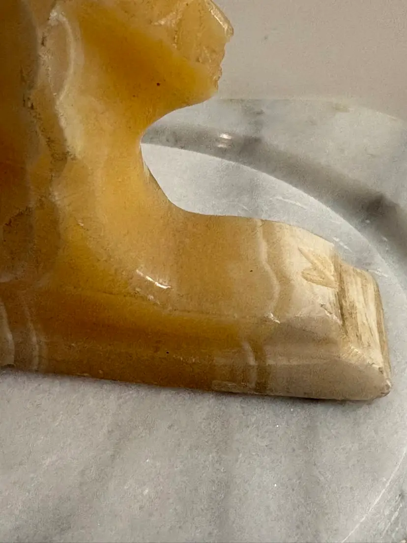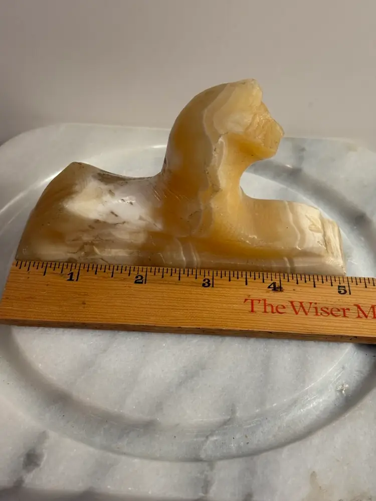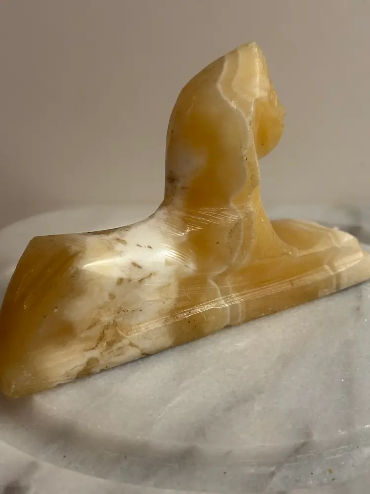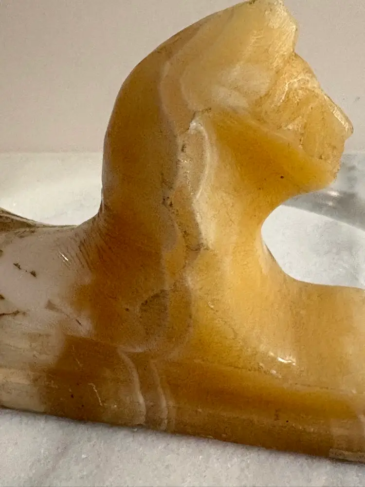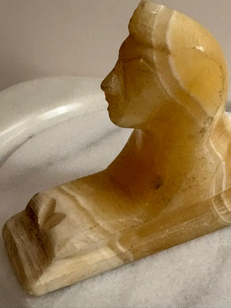 Bring a touch of ancient elegance to your space with this vintage carved onyx sphinx figurine. Featuring warm caramel and creamy white banding throughout the stone, this hand-carved piece is a striking nod to Egyptian revival style. Perfect for display on a bookshelf, desk, or altar — or even used as a unique paperweight.
