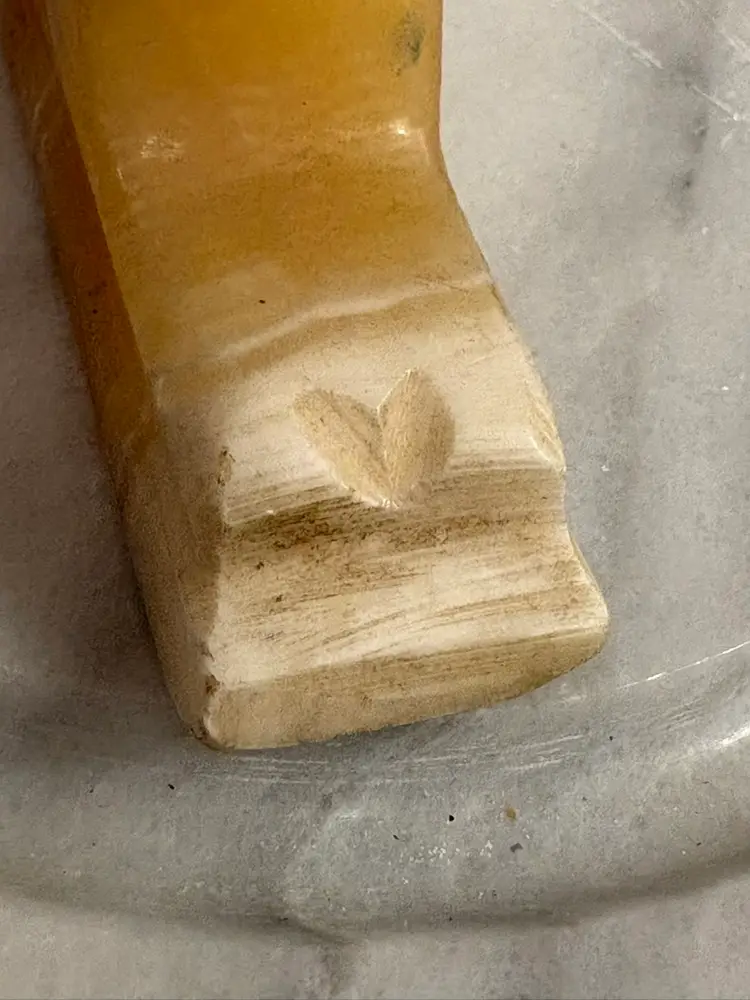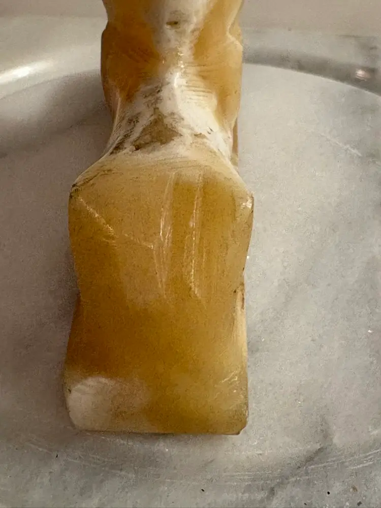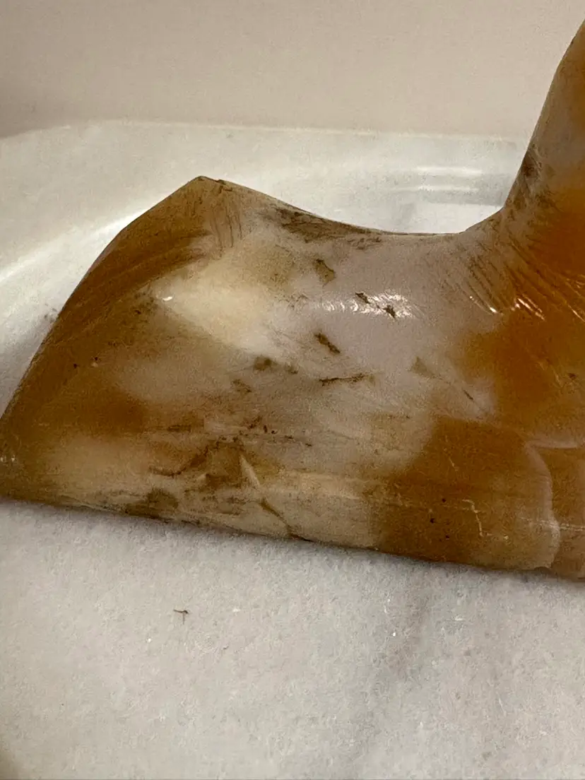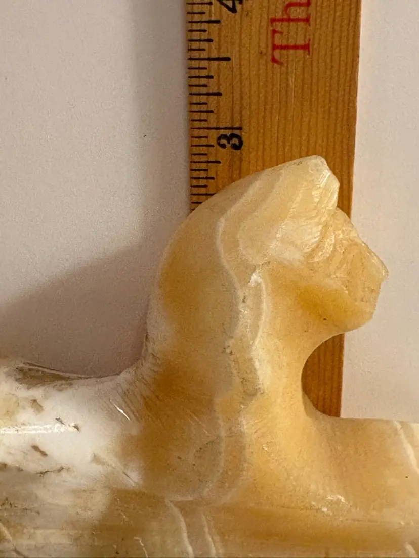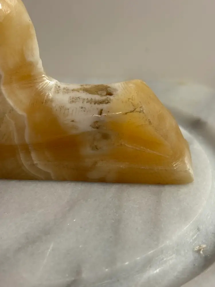 Bring a touch of ancient elegance to your space with this vintage carved onyx sphinx figurine. Featuring warm caramel and creamy white banding throughout the stone, this hand-carved piece is a striking nod to Egyptian revival style. Perfect for display on a bookshelf, desk, or altar — or even used as a unique paperweight.